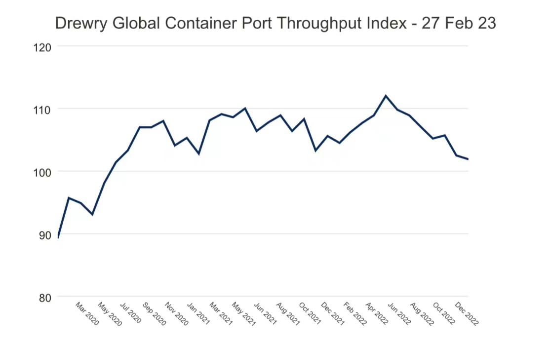 The Global Port Throughput Index weakened 3.0% MoM and 0.7% YoY in December 2022m with Greater China the only region that posted annual gains. Drewry’s Nowcasting model estimates a further 0.5% decline in January 2023.