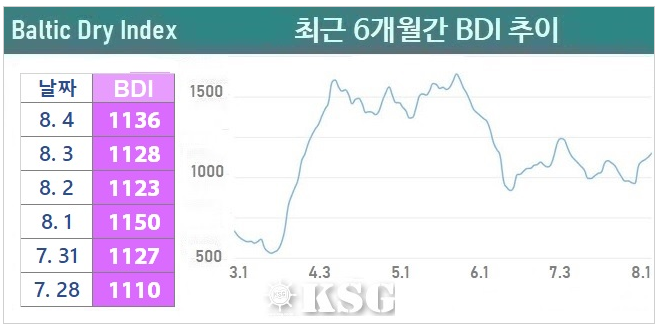 8?4? ???? ????(BDI)? ???? 8??? ??? 1136?? ????. ?? ? ?? ??? ???? ??? ?? ????? ??? ?? ????? ??? ????? ???? ???? ??? ??? ????. ??? ???? ????(KDCI)? 8?4? ?? 1?1207??? ???? 4% ????.