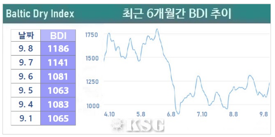 9?8? ???? ????(BDI)? ???? 45??? ??? 1186?? ????. ?? ? ????? ?? ???? ???? ????. ???? ????(FFA) ???? ???? ??? ???? ??? ????. ??? ???? ????(KDCI)? 9?8? ?? ???? 7.4% ??? 1?2469???.